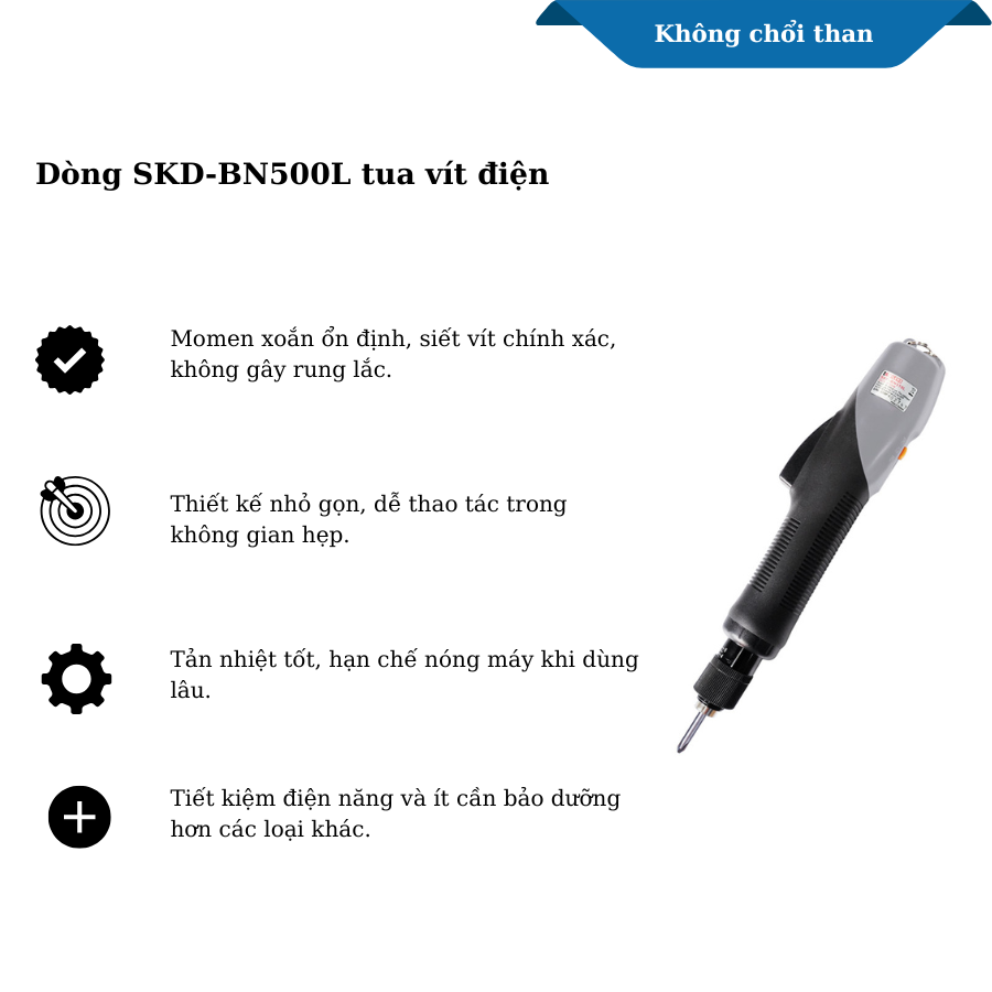 Tua vít điện tự động SKD-BN500L sử dụng động cơ không chổi than DC cho hiệu suất ổn định, vận hành êm và tuổi thọ cao. Dòng “L” có lực siết nhỏ, độ chính xác cao, thích hợp cho lắp ráp linh kiện điện tử và sản phẩm tinh vi. Thiết kế thân máy chắc chắn, cầm nắm cân đối, giúp thao tác chính xác và liên tục trong dây chuyền sản xuất.