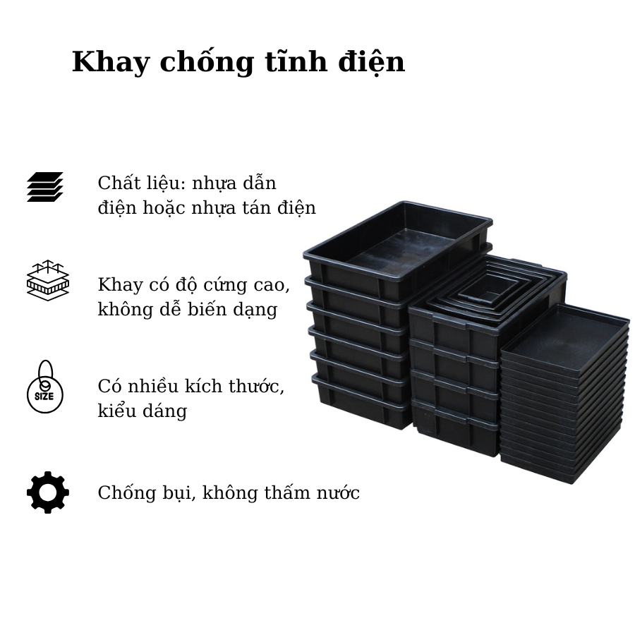 In electronic component manufacturing areas, cleanrooms, or research centers with strict electrostatic control, Antistatic Tray It is one of the essential devices that cannot be replaced. The product is designed to store and classify components and tools during manufacturing or inspection processes without the risk of electrostatic discharge (ESD). With various designs, sizes, and functional options, this product has been widely applied across multiple industries nationwide — particularly in high-tech industrial zones in Northern Vietnam such as Bac Giang, Bac Ninh, and Hanoi.