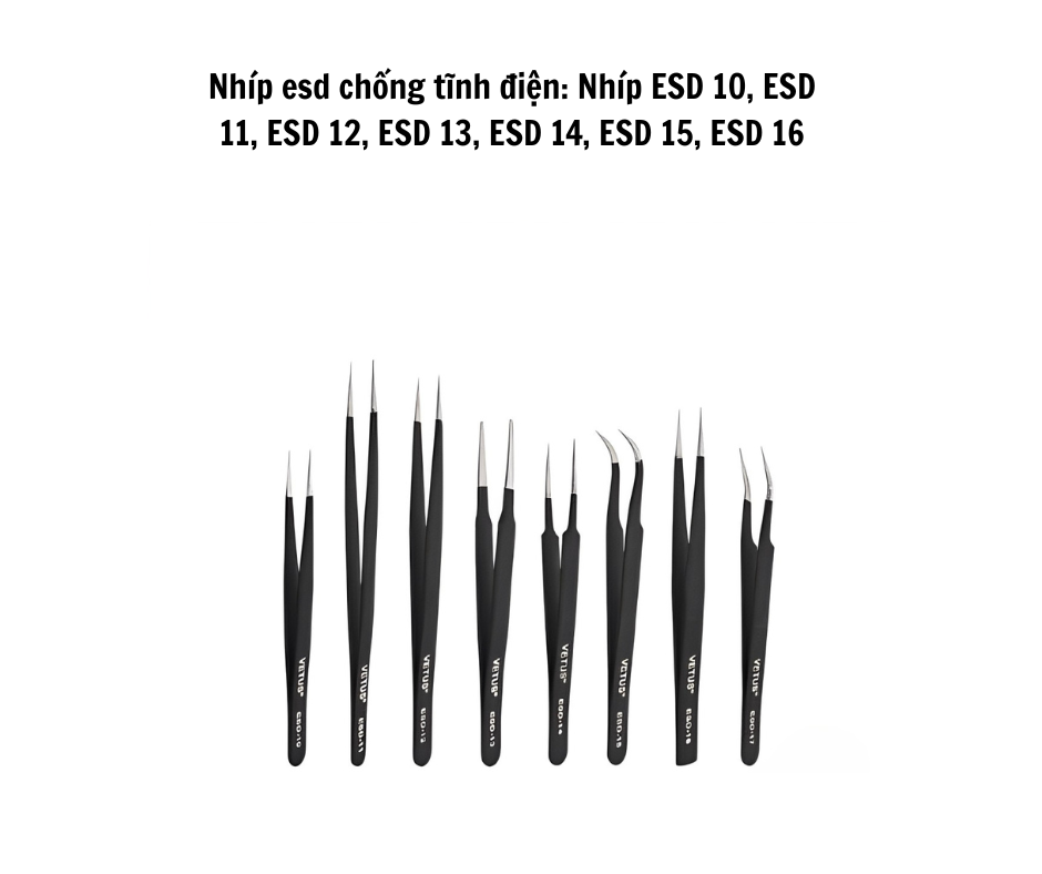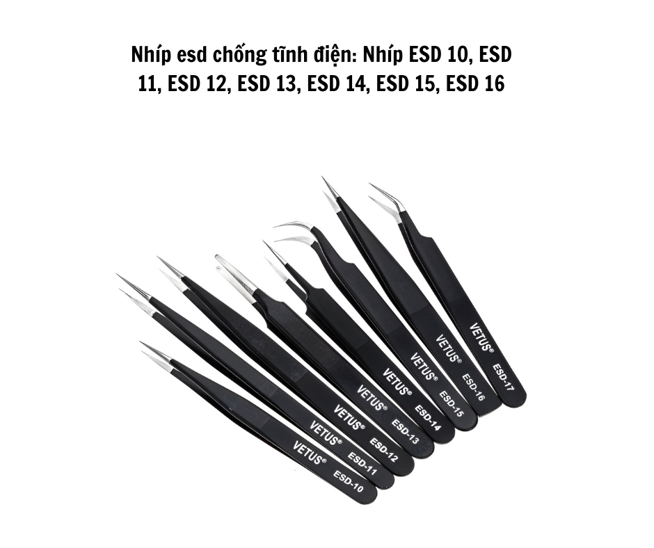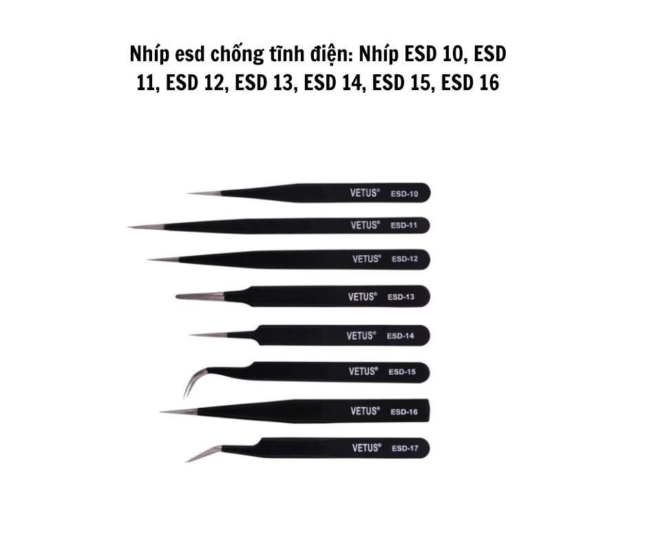 ESD 핀셋 10–16은 스테인리스강에 정전기 방지 코팅이 적용되어 있어 작업 중 민감한 부품을 정전기 방전(ESD)으로부터 보호합니다. 각 모델은 고유한 팁 설계를 가지고 있으며, ESD-10, 11, 12는 직선형 또는 약간 휘어진 팁으로 소형 부품 집기에 적합하고, ESD-13은 넓고 무딘 팁으로 대형 부품에 적합합니다. ESD-14는 초정밀 작업을 위한 매우 날카로운 팁을 가지고 있으며, ESD-15는 45° 각도의 곡선 팁으로 좁은 공간에서 편리하게 사용할 수 있고, ESD-16은 넓은 팁으로 회로 기판이나 대형 부품 집기에 적합합니다. 본 제품은 내구성이 뛰어나며 비자성이고 부식되지 않아 클린룸, SMT 및 전자 제조 환경에서 사용하기 적합합니다.