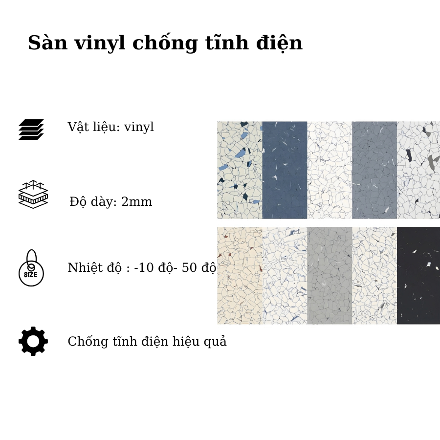 - Chất liệu: Nhựa PVC nguyên sinh kết hợp hạt carbon dẫn điện phân tán đều