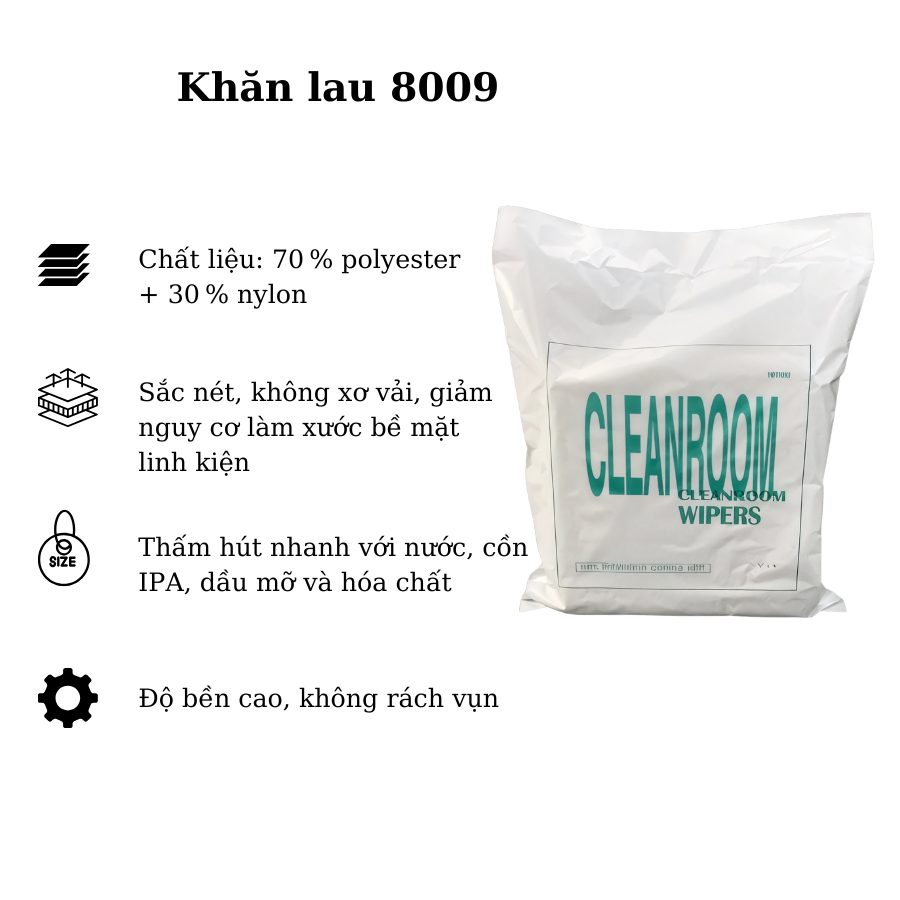 8009 无尘室擦拭布由涤纶与尼龙混纺制成,质地柔软、吸液性强且不产生灰尘。边缘采用激光切割工艺,有效防止纤维脱落,适用于无尘室、电子设备、医疗及半导体等领域。